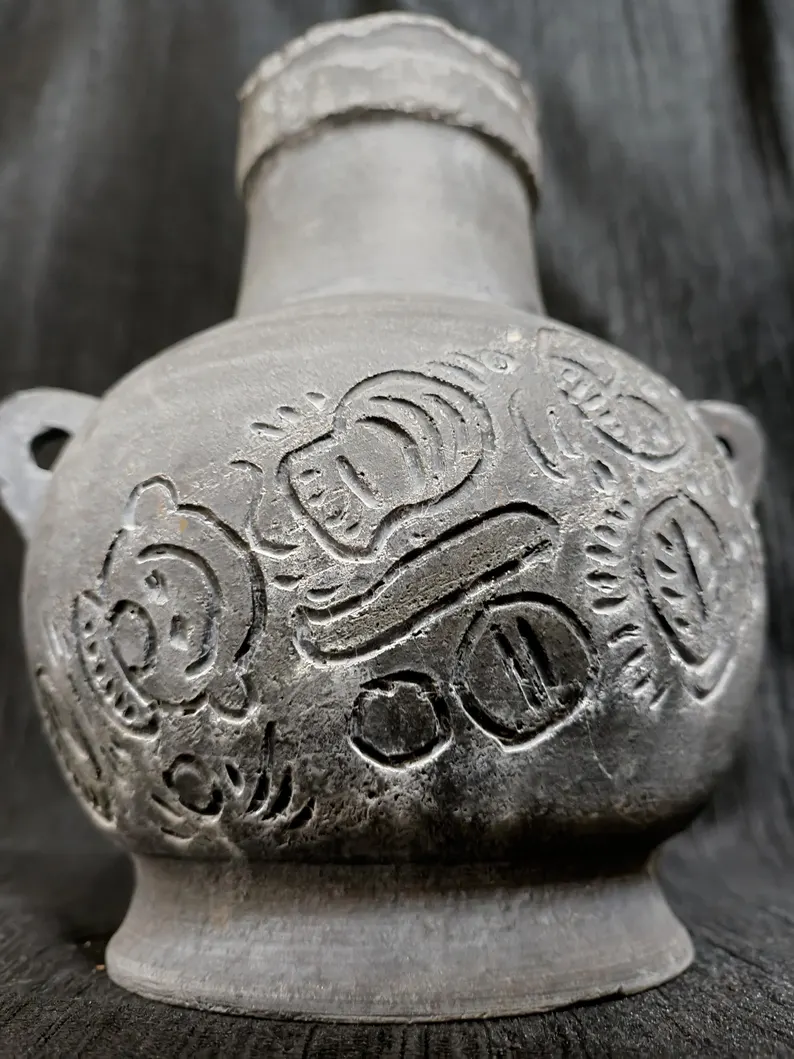 Terracotta Clay Pot, Deep Charcoal Pot, Blackish-Gray Pot, Non-Glossy Finish Pot, Raw Textured Surface, Dragon Face Motif Pot, Mythical Pot