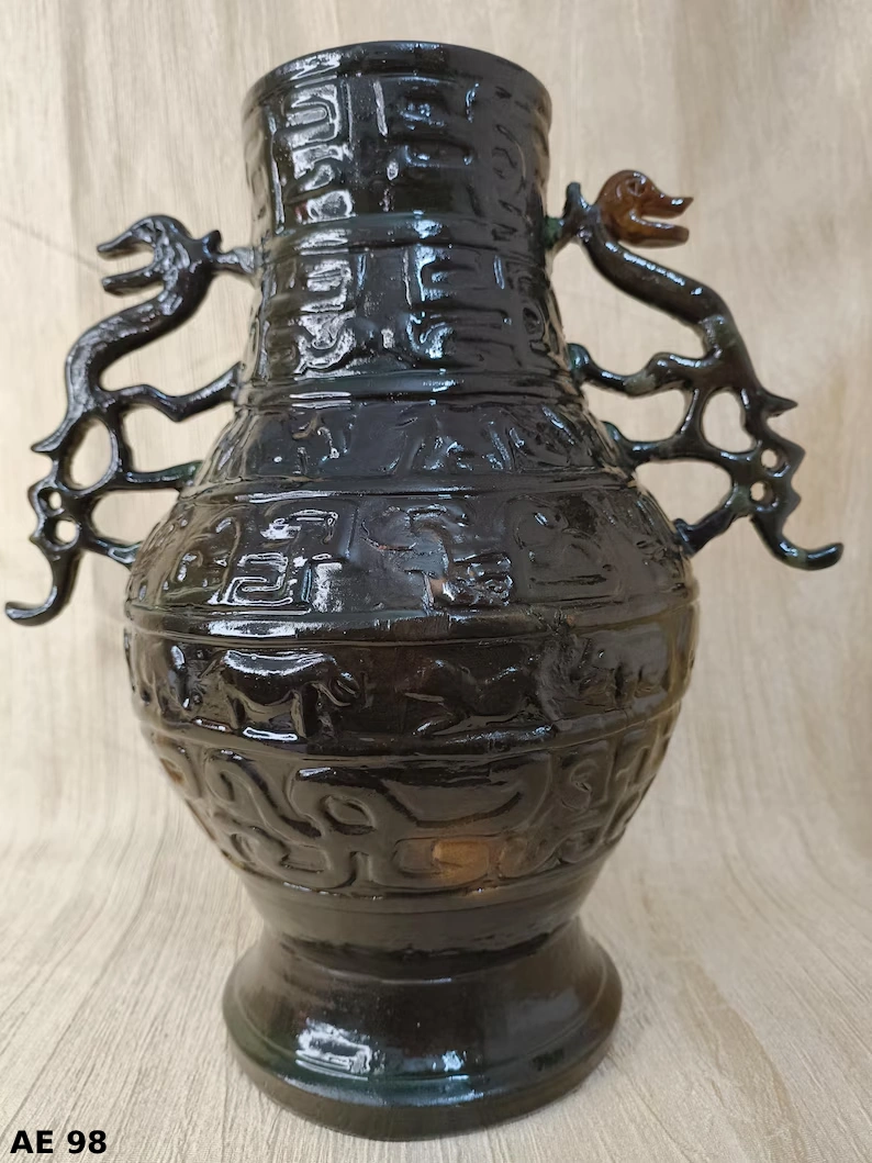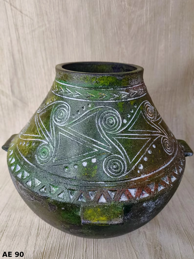 Terracotta Clay Vase, Deep Black-Brown Pot, Green Highlights Pot, High-Gloss Finish Vase, Cultural Depth Pot, Artistic Terracotta Vase