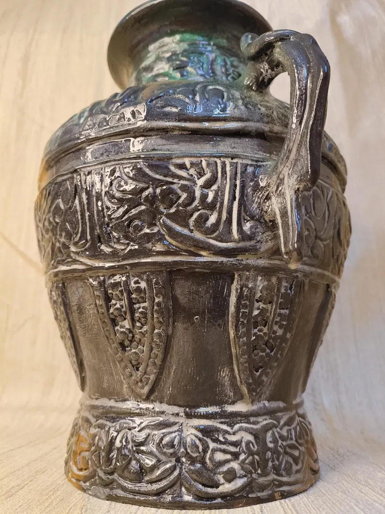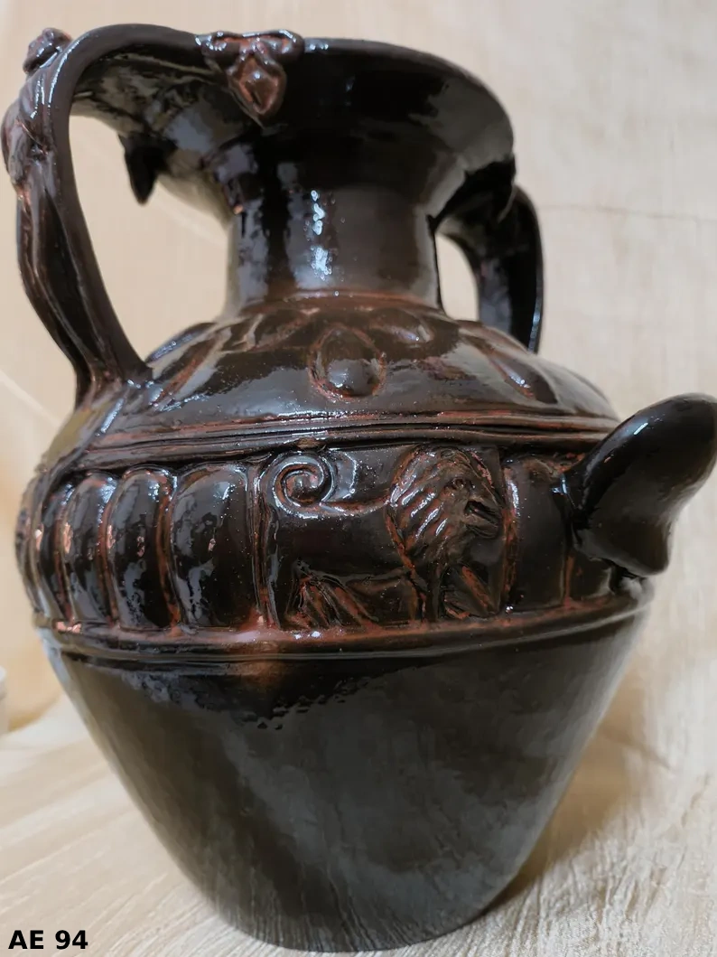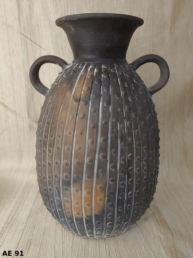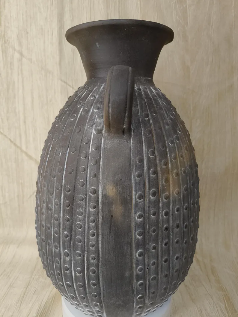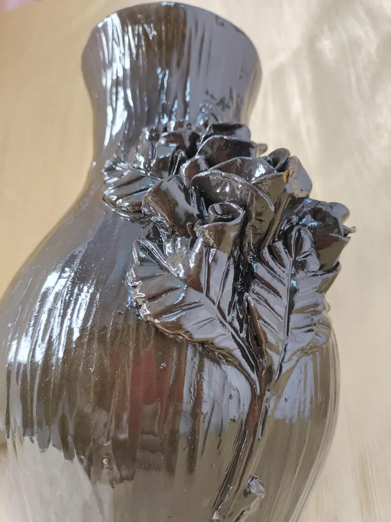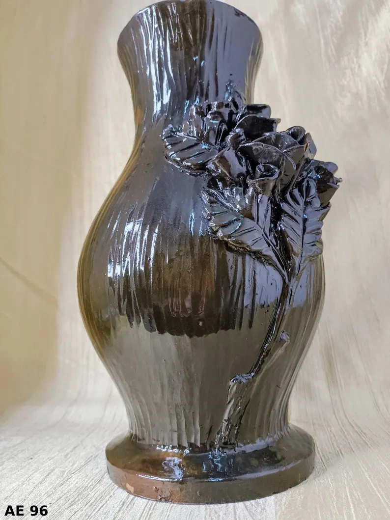 Terracotta Clay Amphora, Jet Black Pot, High-Gloss Finish Pot, Wide Body Vase, Decorative Leafy Design Pot, Handcrafted Pottery Decor
