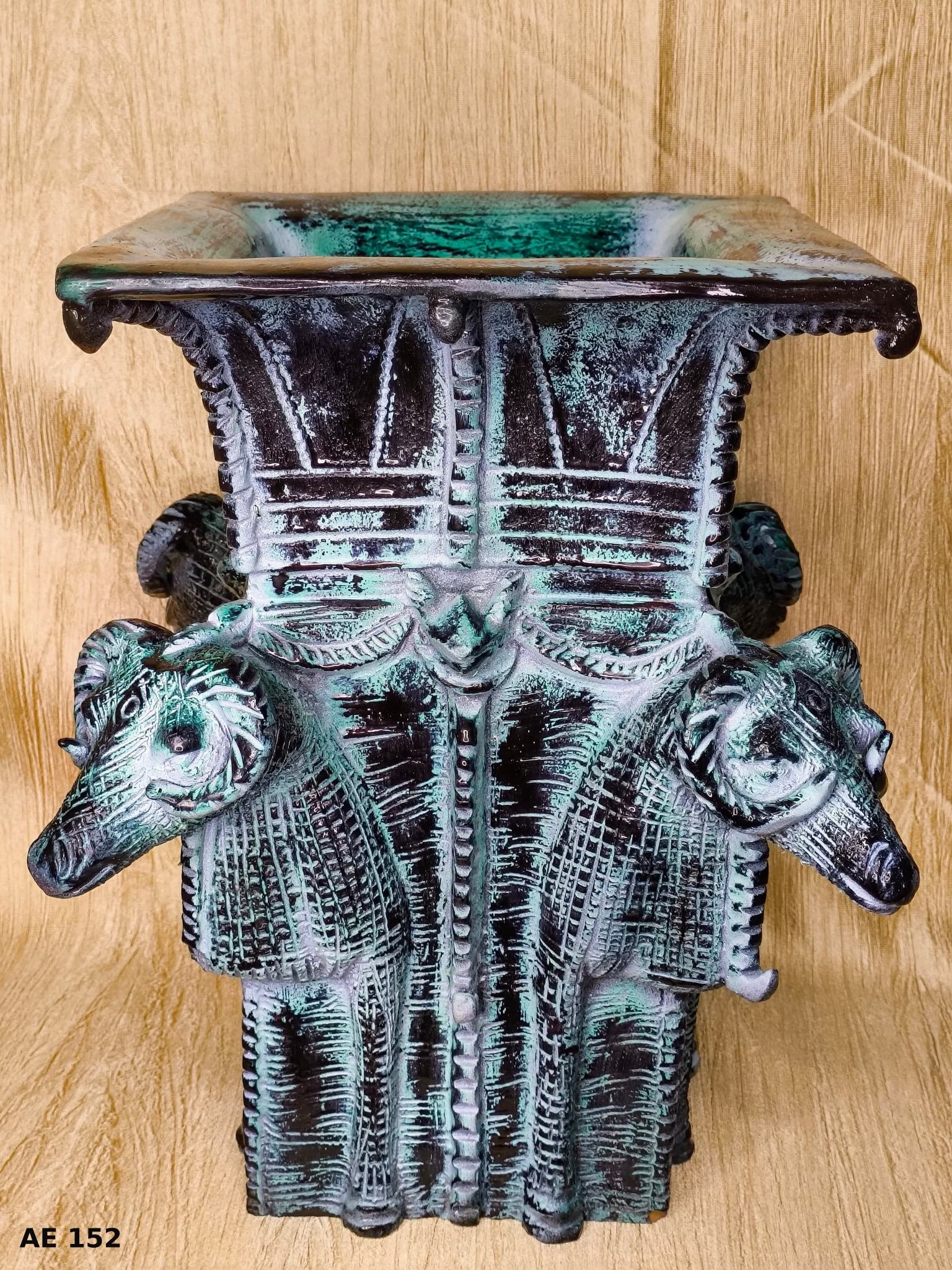Handcrafted Terracotta Ram Head Pot – Square Ceramic Vessel with Distressed Green & Black Patina