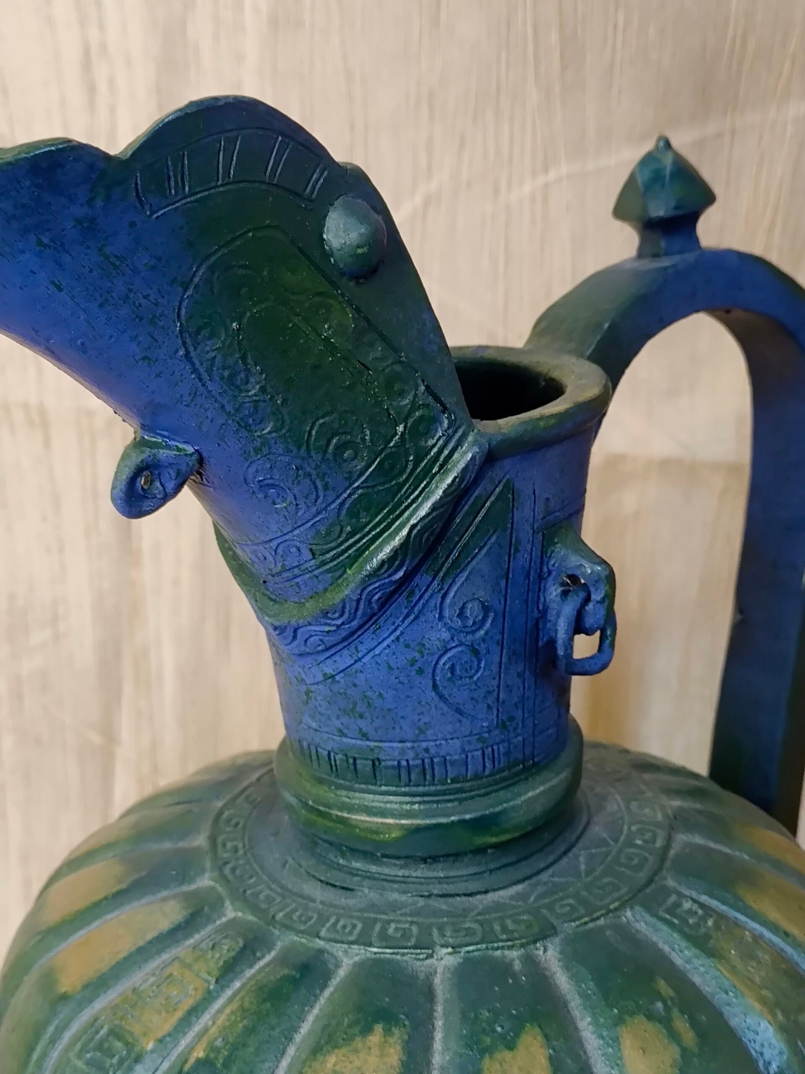 ✦ Spout: Tall angled spout with carved detailing