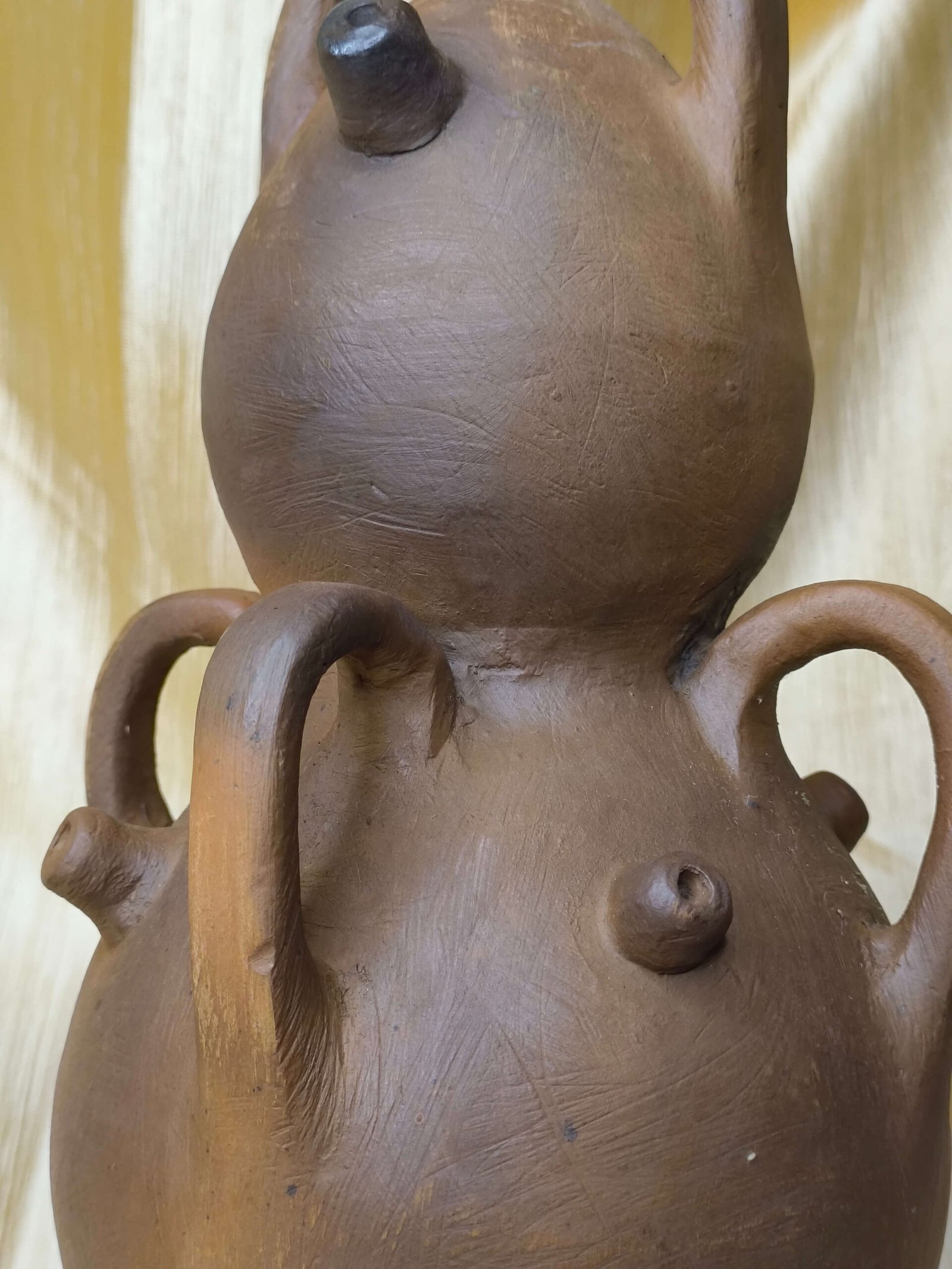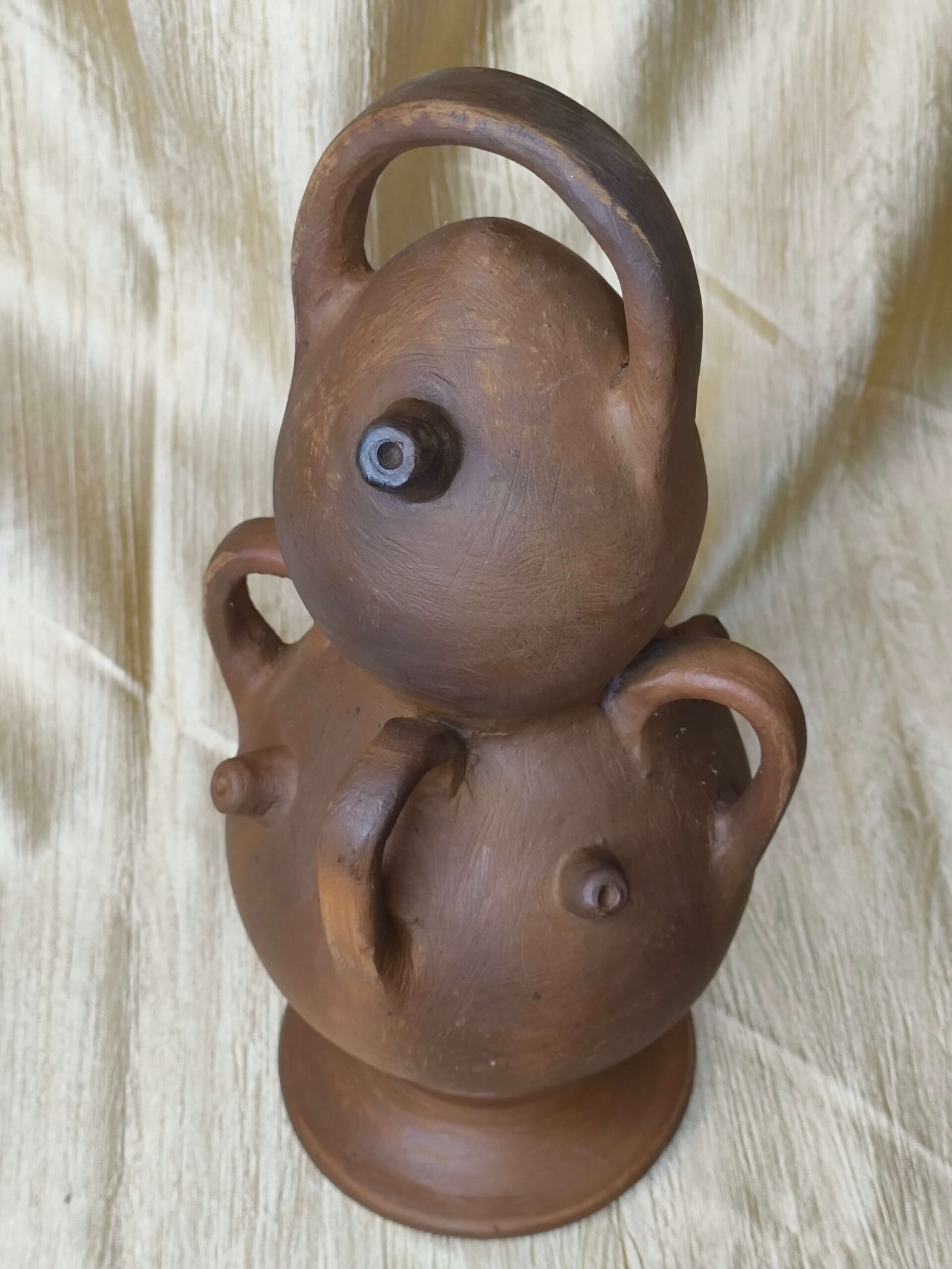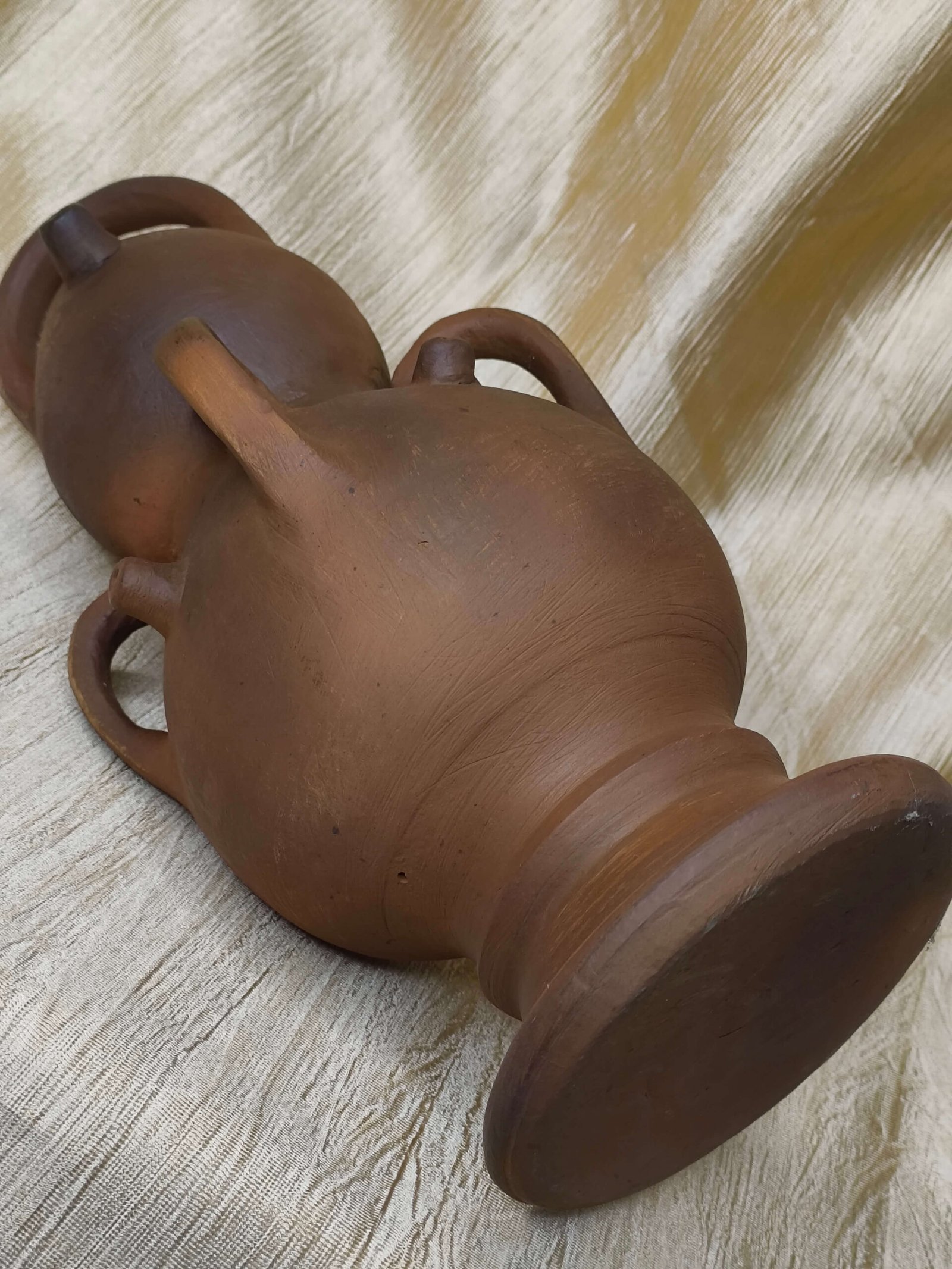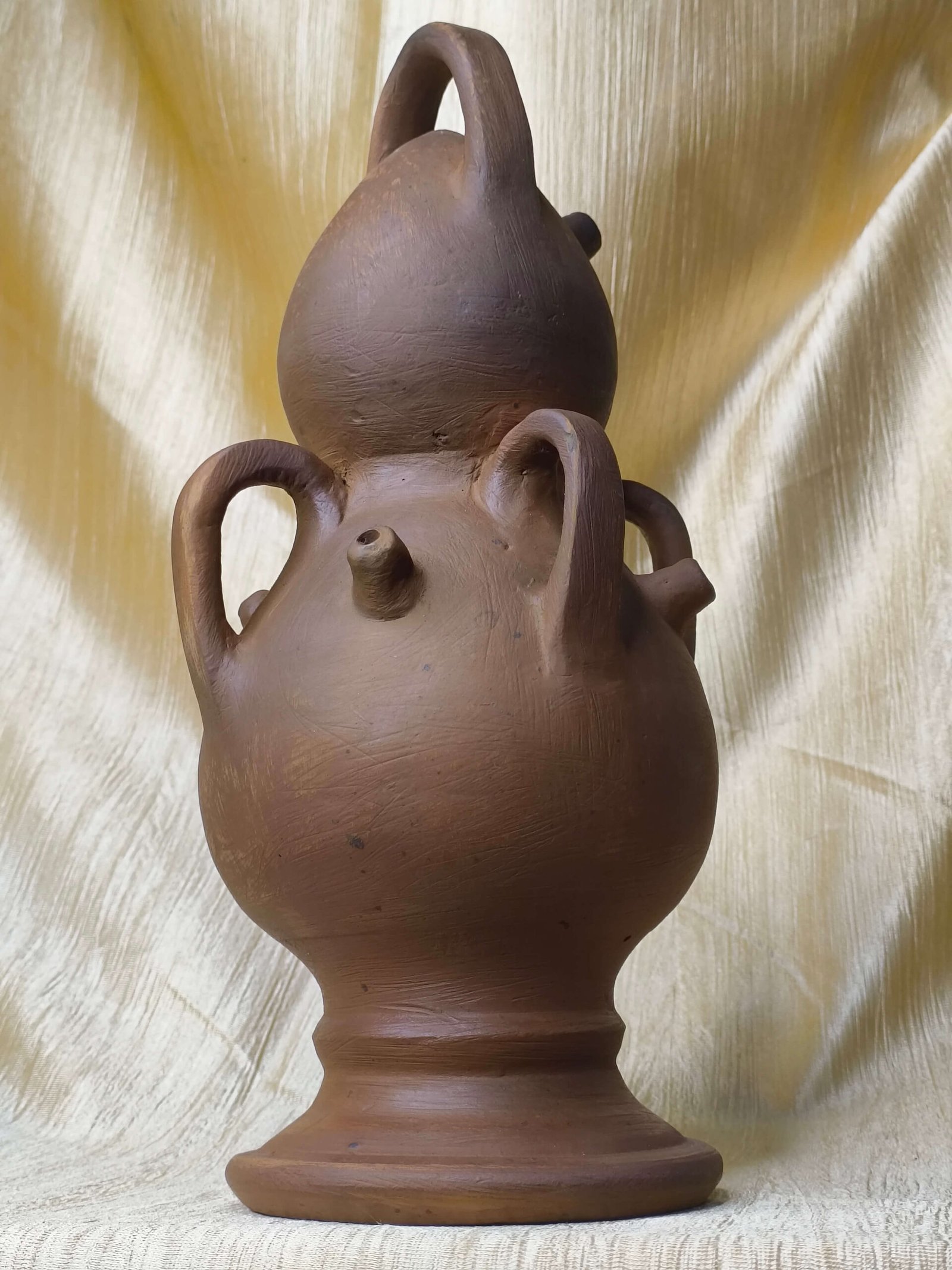 ➤ This distinctive terracotta vessel features a stacked double-bulb body with four functional handles, combining practicality with artistic form.
