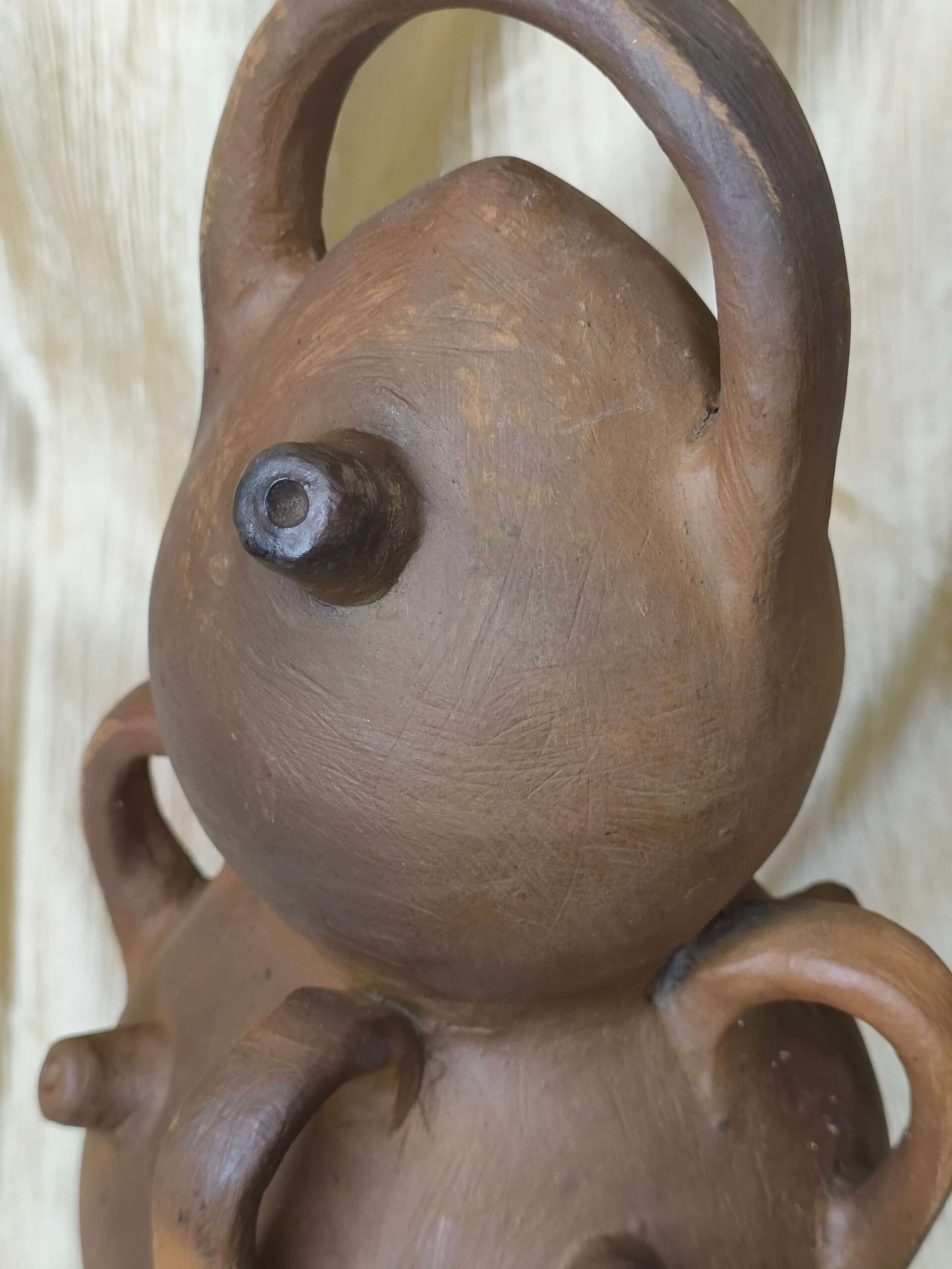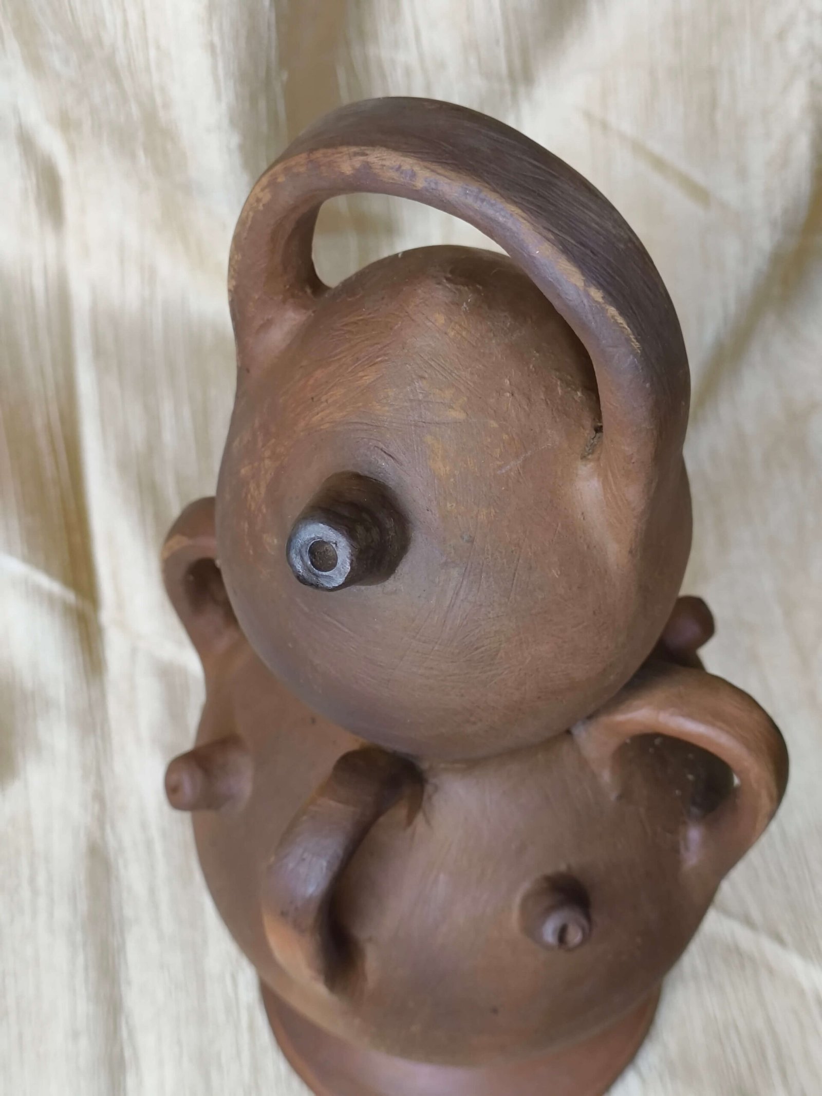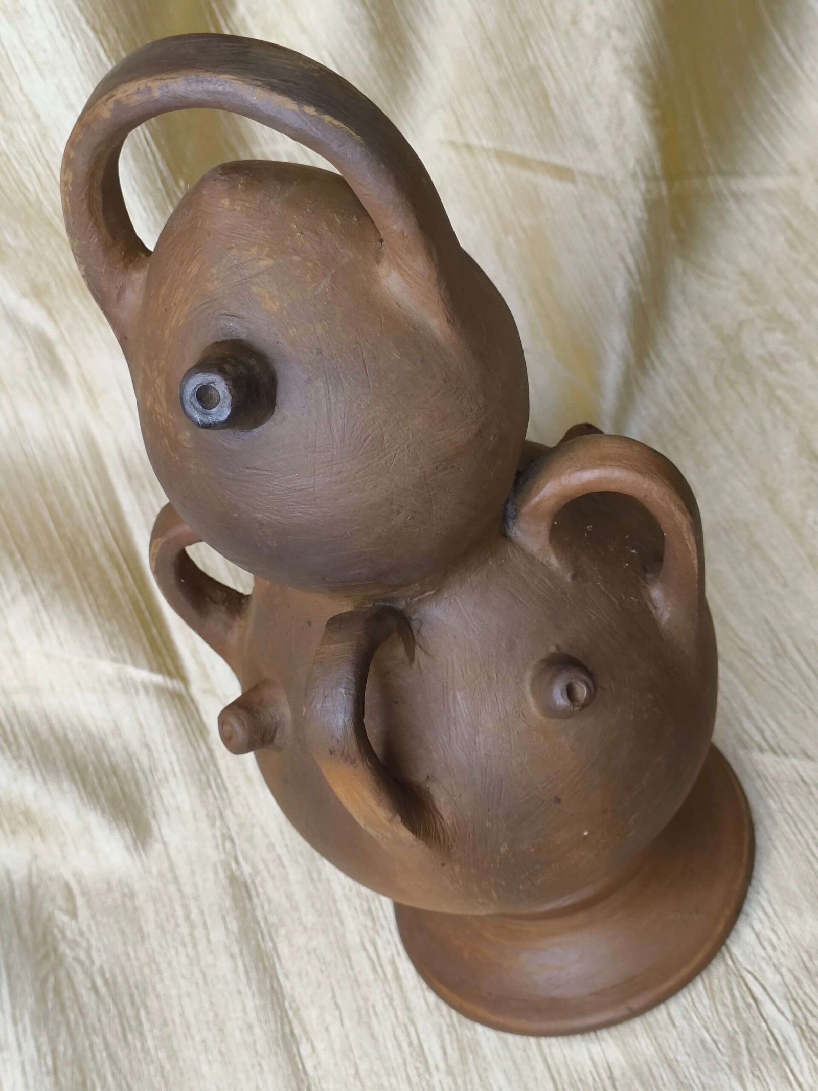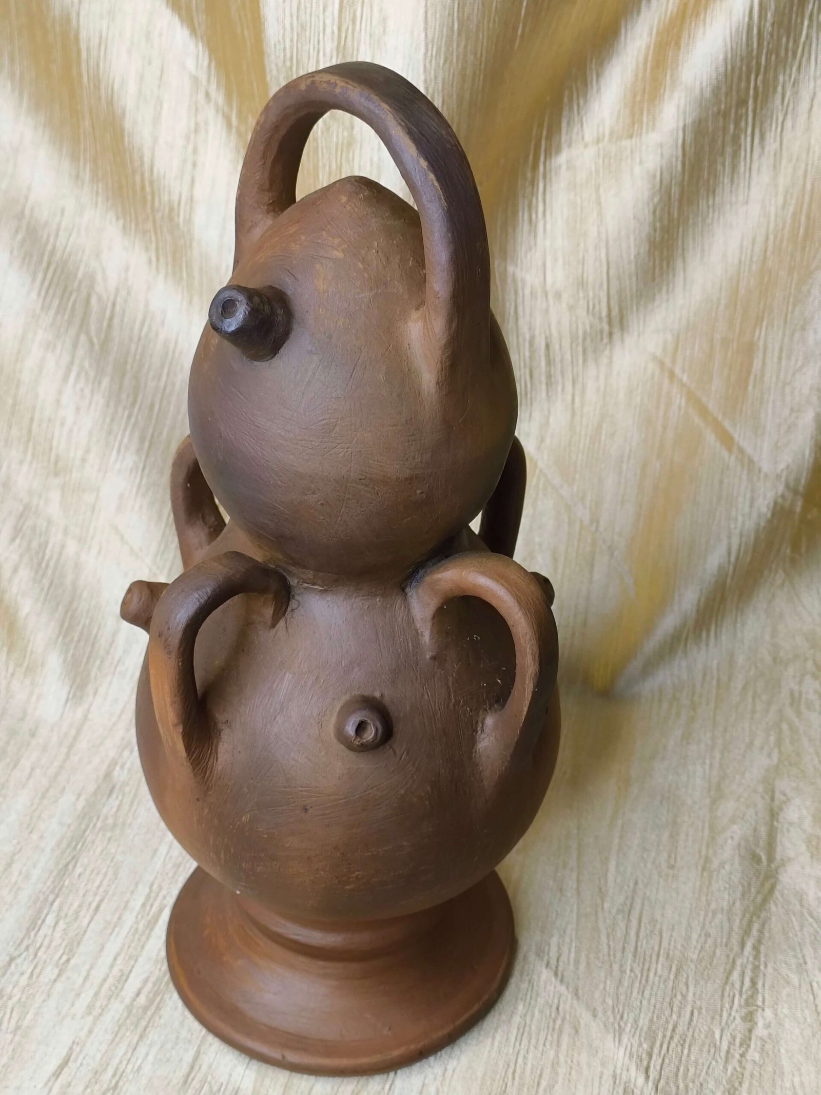 ➤ This distinctive terracotta vessel features a stacked double-bulb body with four functional handles, combining practicality with artistic form.
