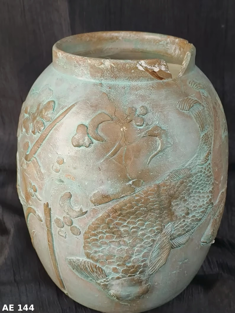 ➤ The weathered greenish-blue patina, with hints of copper-like tones, suggests the jar’s age or oxidation, adding a vintage appeal.
