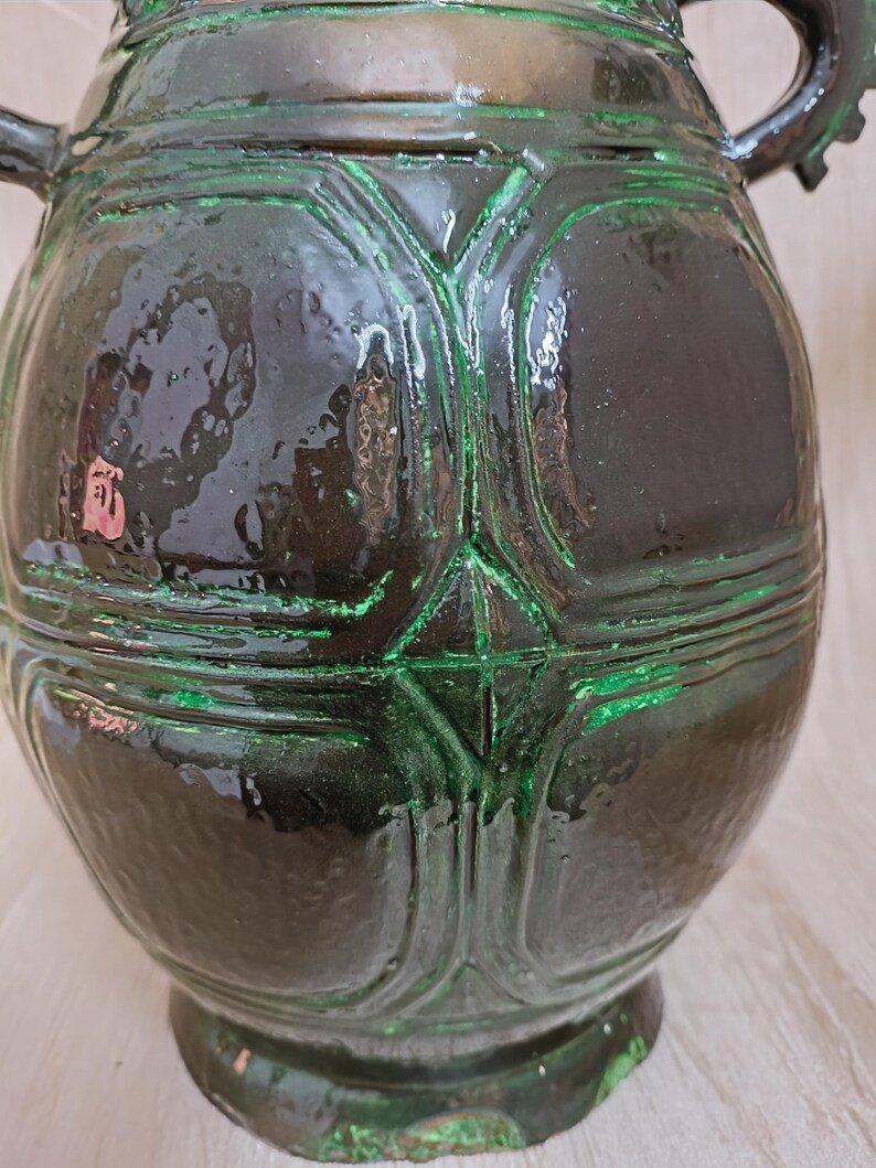 ✓ Bulbous, elegant form with detailed raised motifs highlighted in green